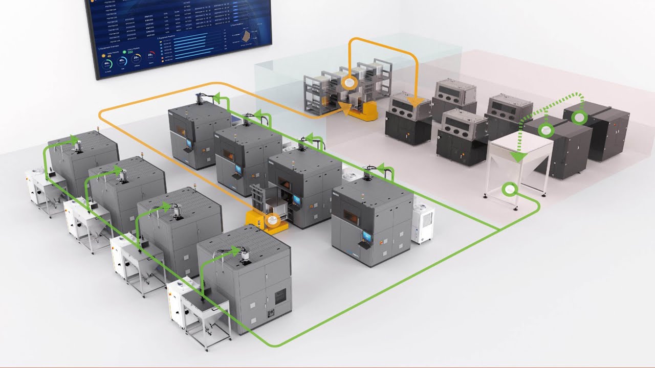 스마트 생산 라인 통합은 파우더 처리, 빌드 이송, 냉각 및 브레이크 아웃을